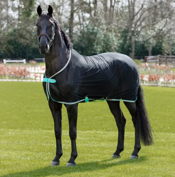 Lightweight and breathable cooler for warm weather. Texturized polyester net. Classic cut, wicks away moisture from your horse. Single front closure, detachable cross surcingles and fillet string. Comes with handy storage/wash bag.