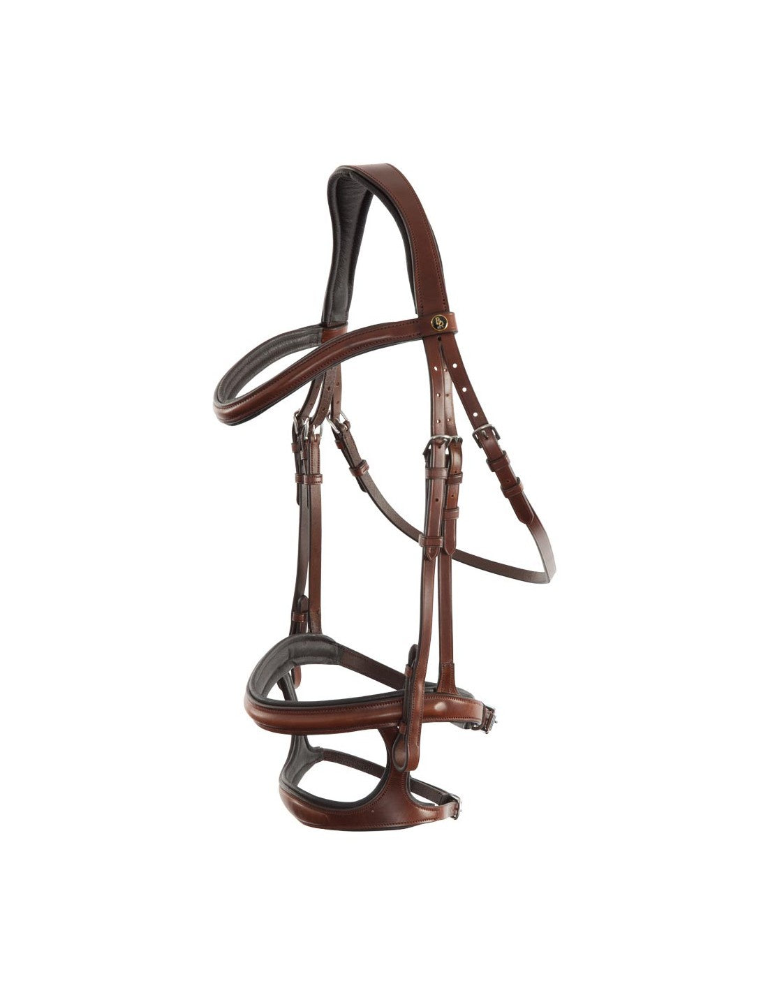 This symmetric bridle made of high-quality European leather features an E-Line headpiece. This anatomically shaped headpiece is softly padded and provides extra freedom behind the horse’s ears thanks to its round shape. The curved browband is round raised and features soft padding. The throatlash can be adjusted on both sides. The cheekpieces are fitted with hook stud billets. The bridle has a double noseband, which combines the effect of a traditional cavesson and a drop noseband. As a result, this noseband is suitable for strong horses. The distance between the two nosebands is approx. 7 cm. The plain cavesson (approx. 3 cm wide) is round raised, softly padded and equipped with a soft chin pad. The drop noseband is raised at the front and partially padded. The rear of this noseband looks like a flash strap. The buckle of this strap features an extra protection flap. The bridle features shiny, silver-coloured fittings made of chrome-plated brass. Supplied without reins.