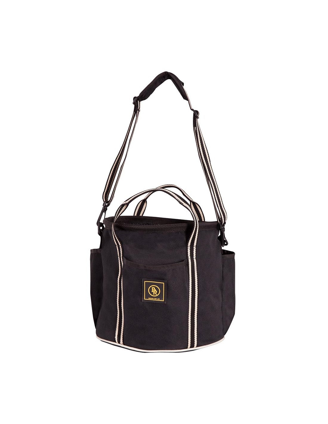 Round, lightweight grooming bag made of 600D polyester. The reinforced bottom features four supportive studs. The contents of your bag can be covered by using the drawstring. The bag features three outer compartments. In addition, the bag has carry handles and an adjustable, detachable shoulder strap. This bag is very convenient for storing your grooming kit and stable equipment. Dimensions: 28 x 28 x 25 cm (l x w x h).