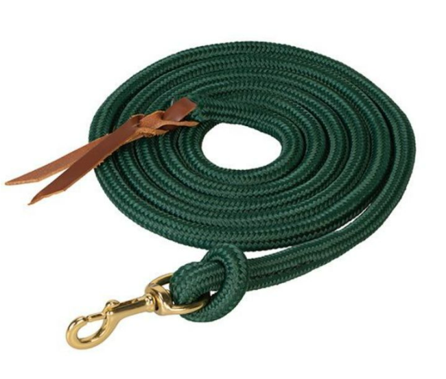 Poly cowboy lead in an array of beautiful colors is made from UV-resistant polyester for the ultimate in durability and long life. Constructed with a swivel snap on one end and a leather popper with bleeding heart knot on the other end. Measure 5/8" x 10'.