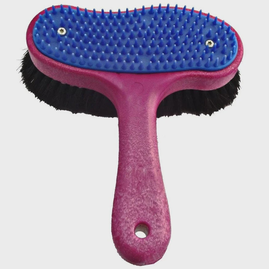 A special double brush for foals. With soft black horses hair on one side and soft massaging curry comb on the other side., Every foal loves them. Blue handle.