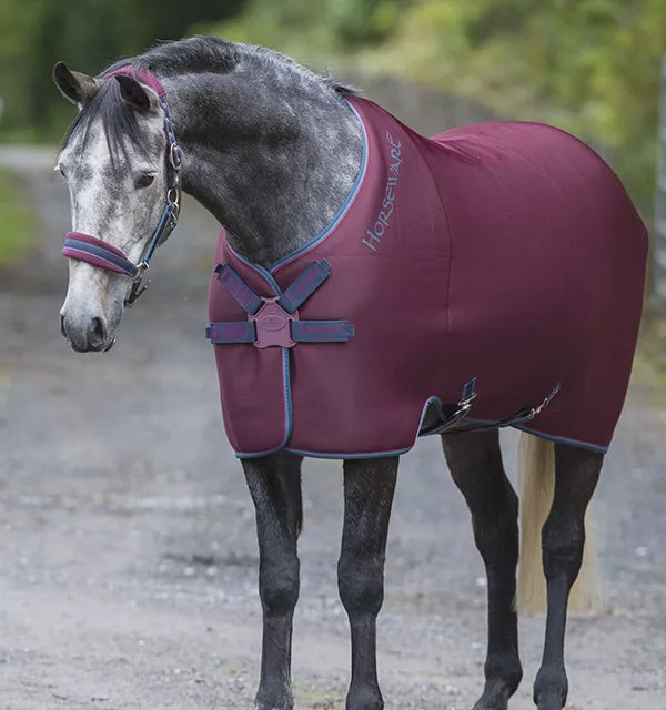 The lightweight Rambo® Airmax Cooler is made from Polyester airmesh. This classic cut cooler has a soft absorbent inner to wick moisture, whilst the 3D construction keeps the horse warm in cold weather and allows maximum airflow in hot weather. The smooth outer on this multi-purpose rug means that it can be worn in the stable without attracting shavings or hay. This rug is fitted with detachable surcingles, disc front closures, and a fillet string. The Rambo® Airmax cooler also comes with a smooth airmesh shoulder lining and leg arches. Burgundy.