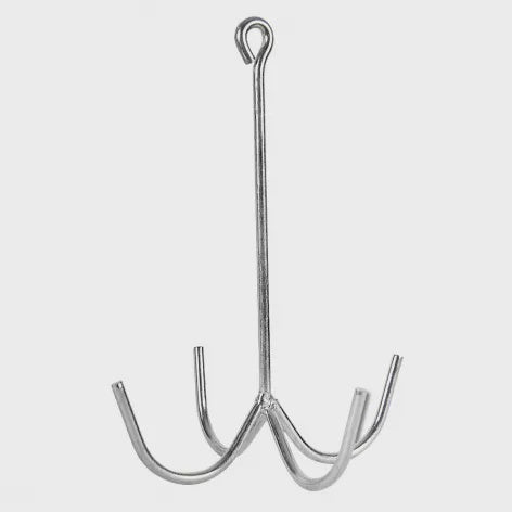 Four prong steel tack cleaning hook with loop at the top for easy hanging.